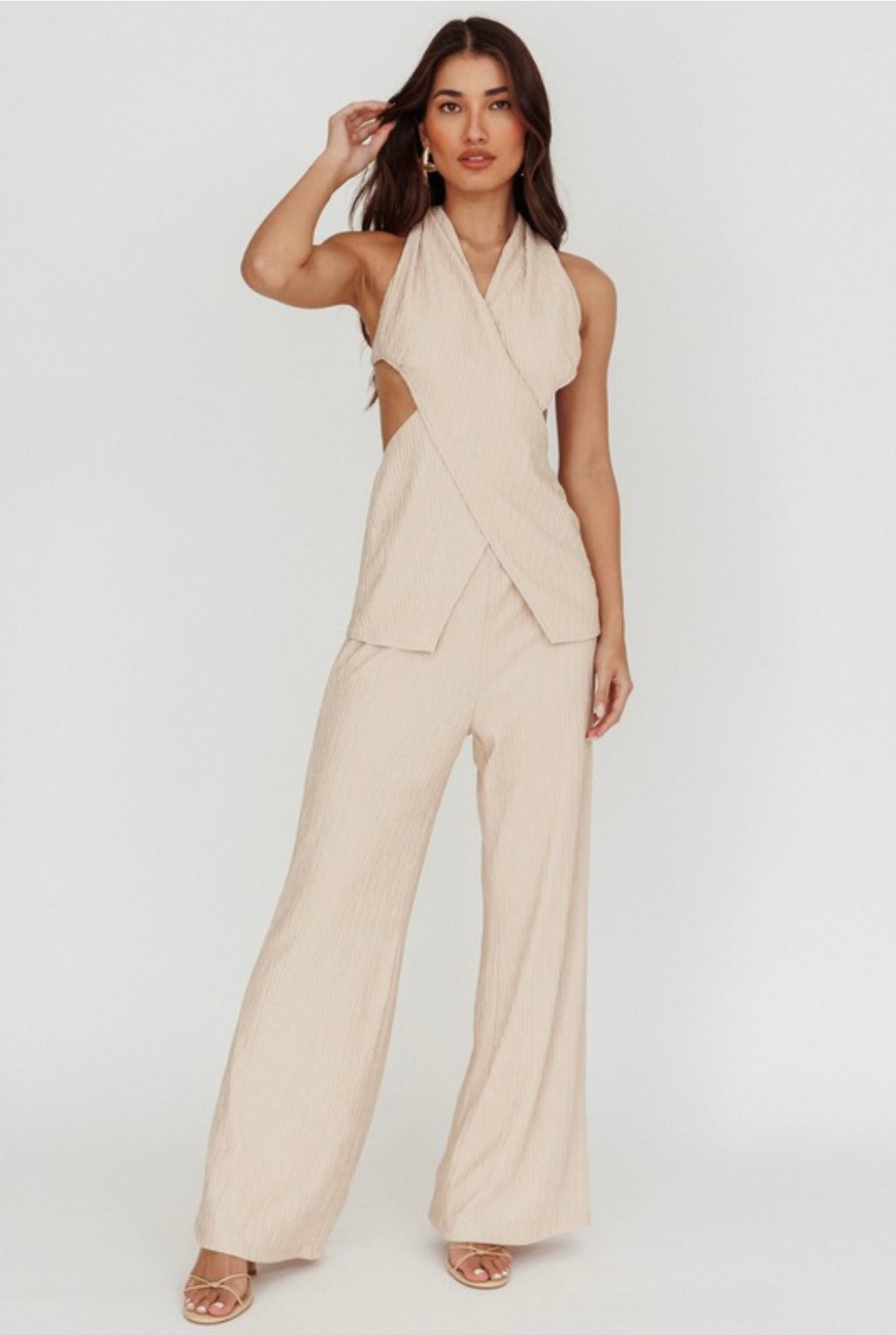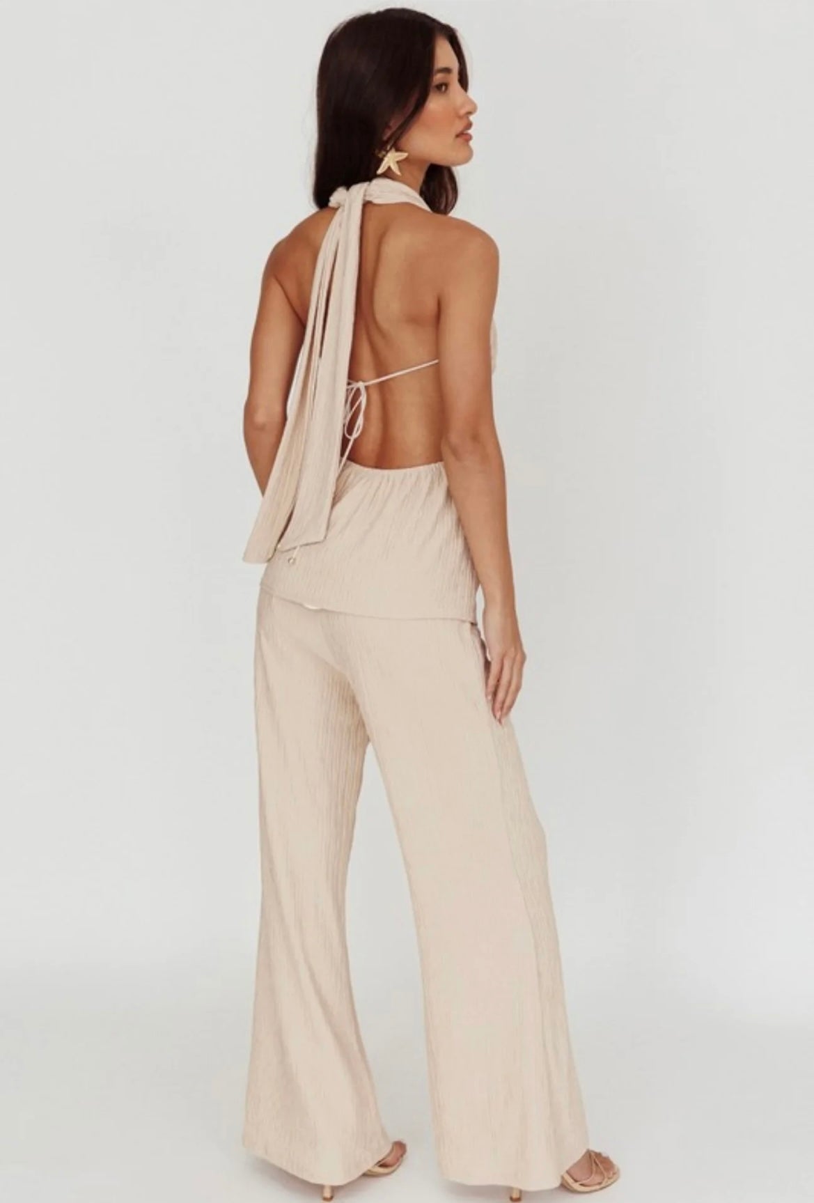 A chic set. Combining an elegant halter neck style with drawstring backless top. Offers fluid movement and natural texture. The pants are a high waisted style with an elasticated waist and wide leg.