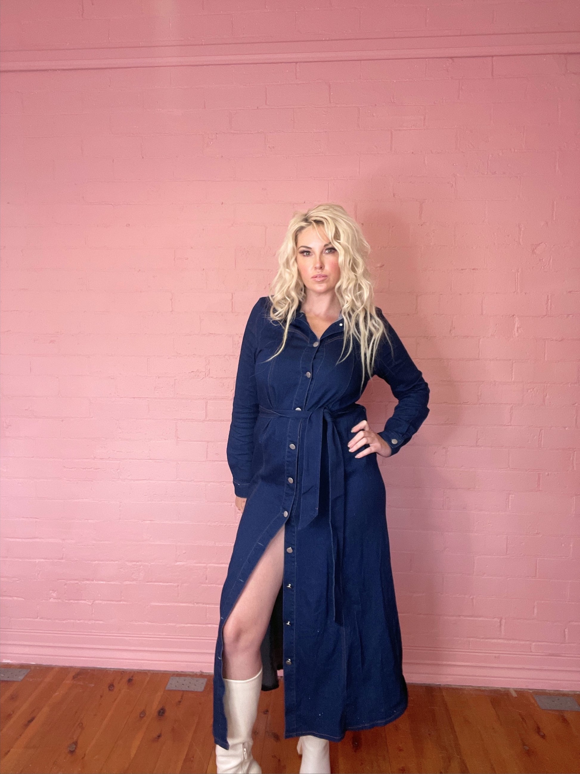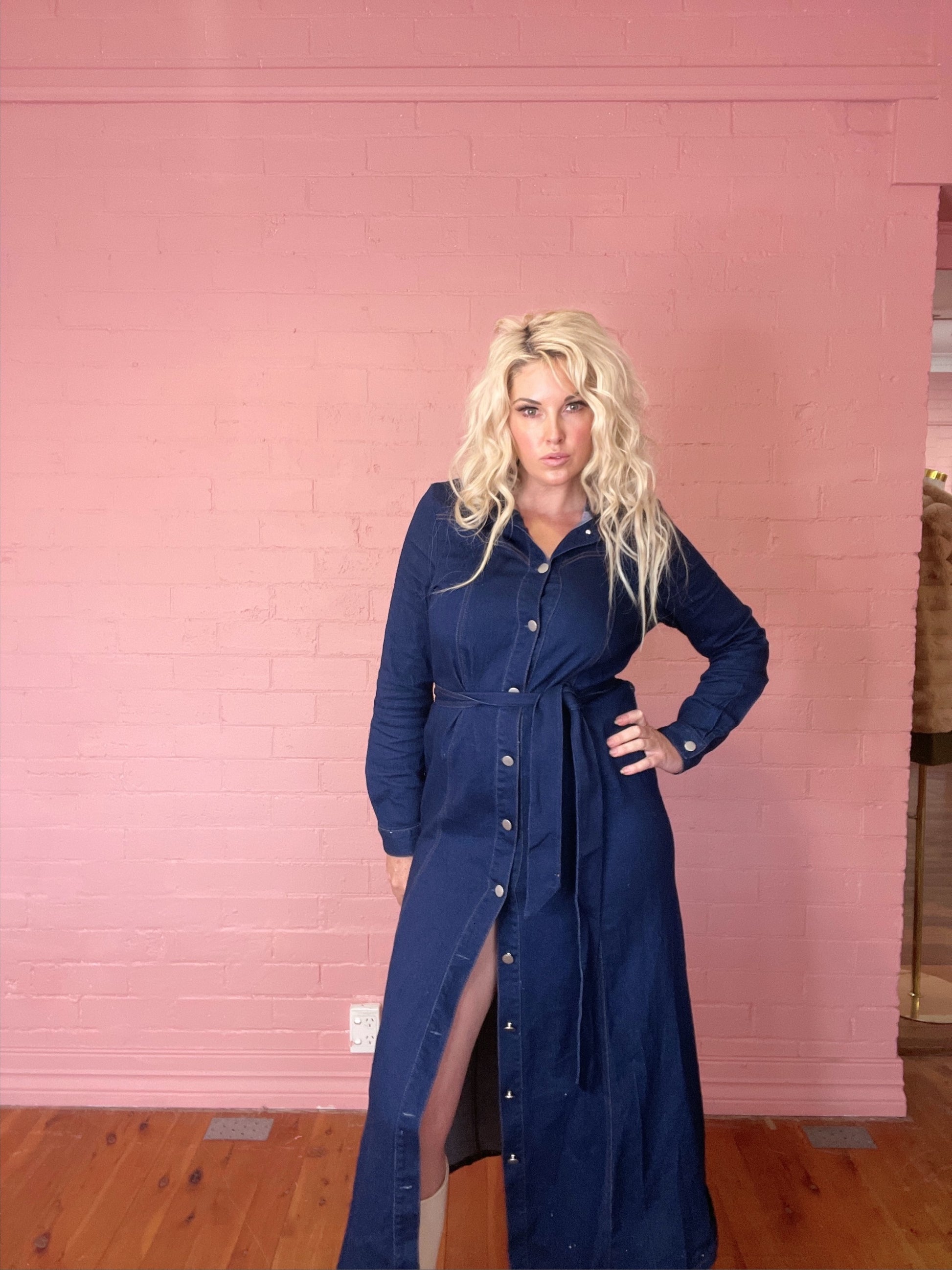 Step into effortless sophistication with our Indigo Elegance Denim Belted Shirt Dress. Crafted from premium mid-weight denim, this full-length shirt dress features a classic collared neckline, long sleeves with button cuffs, and a full front button closure for customizable styling. The waist-cinching self-tie belt enhances your silhouette, while the daring front slit adds a touch of bold femininity.