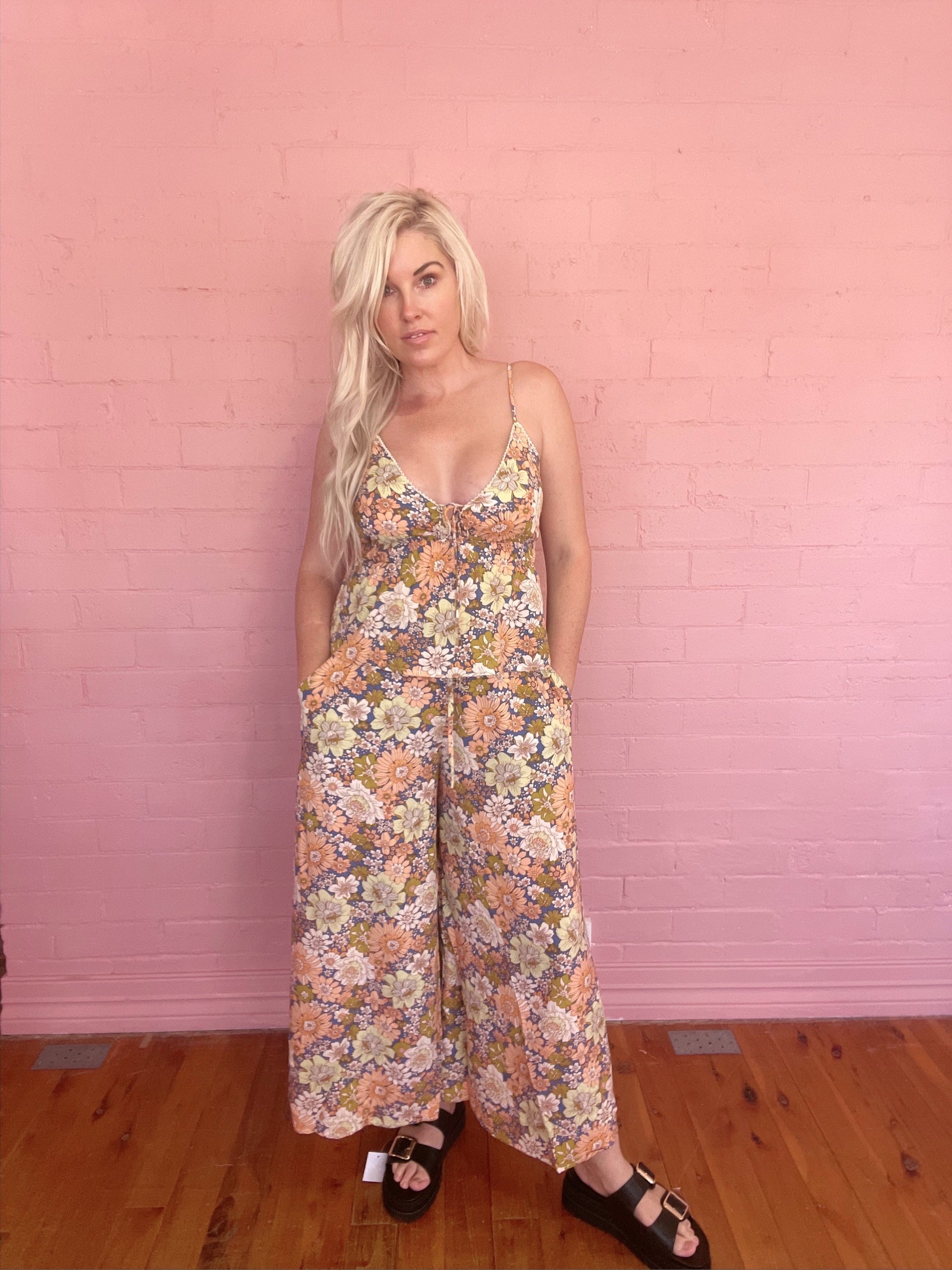The Iris orange and blue floral pant- A fusion of comfort and contemporary this autumn. The pants feature an elastic adjustable waist with a flattering high waist silhouette, providing a customizable fit that accentuates your curves. The wide leg design offers both comfort and a fashion forward look. Two side pockets add practicality to the chic design.