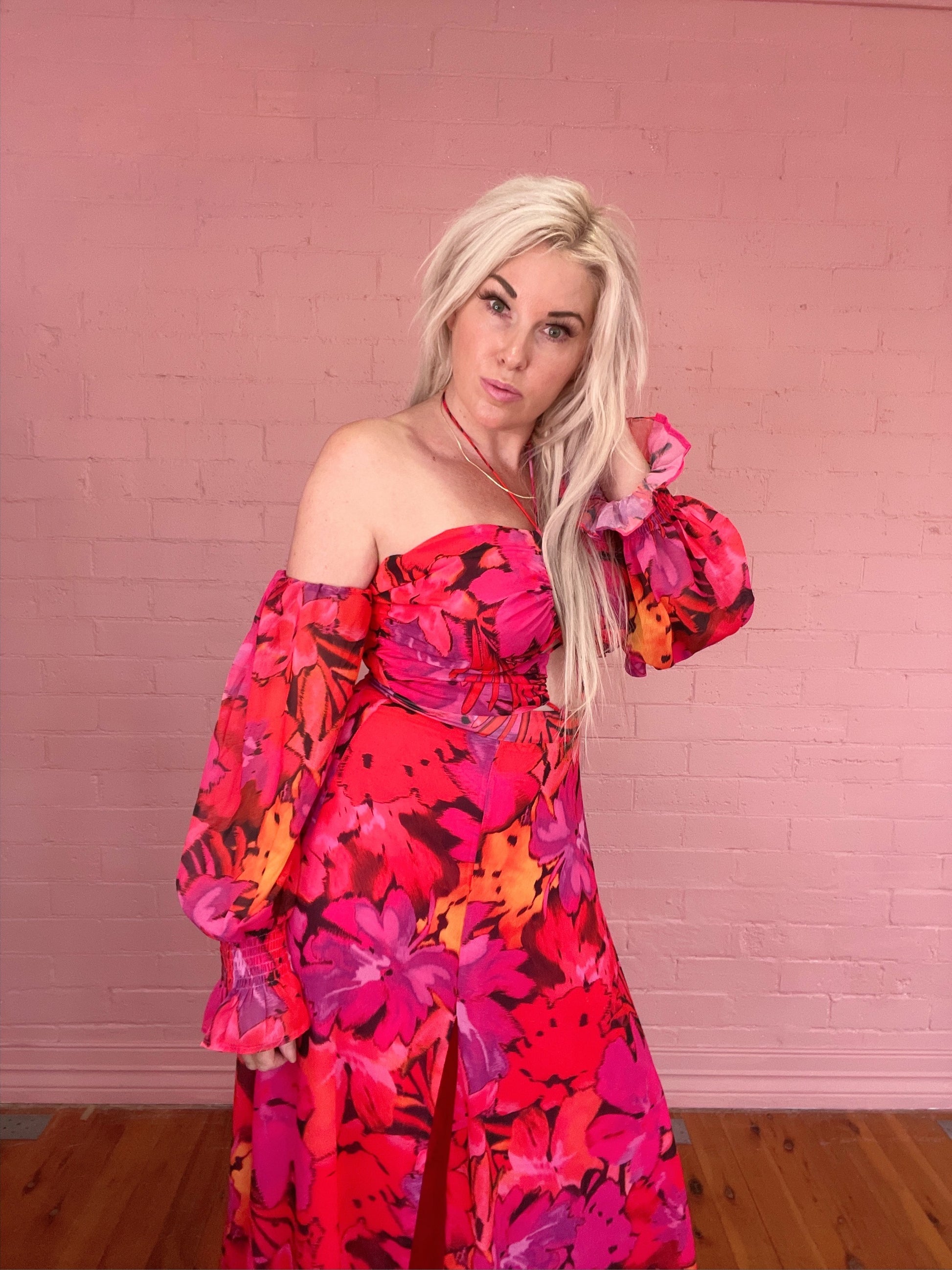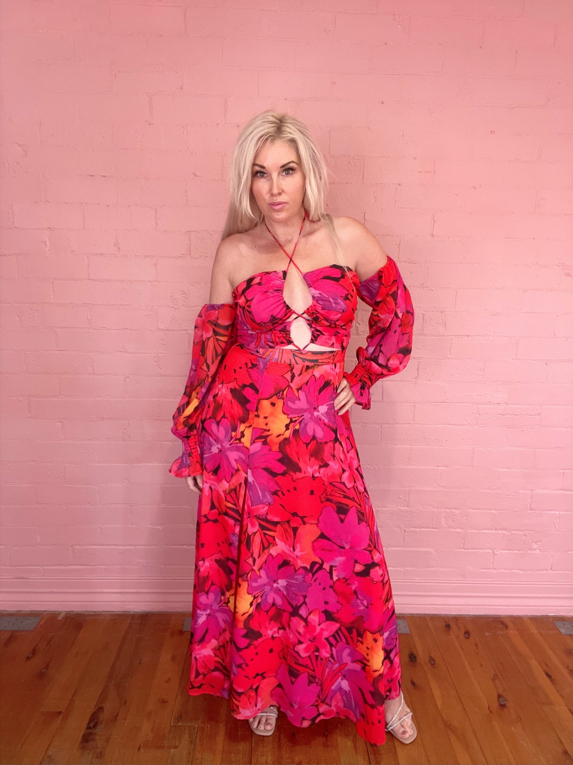 Our Karma Maxi Dress features a halter neck style, cut outs under the bust, side split, off the shoulder elastic sleeves, and an invisible centre back zipper. This garment has lining and no stretch. 100% Polyester. Please refer to care label for garment care instructions. Colours may appear slightly different to the website due to lighting, computer picture resolution and monitor settings. Print placement may vary between each individual item