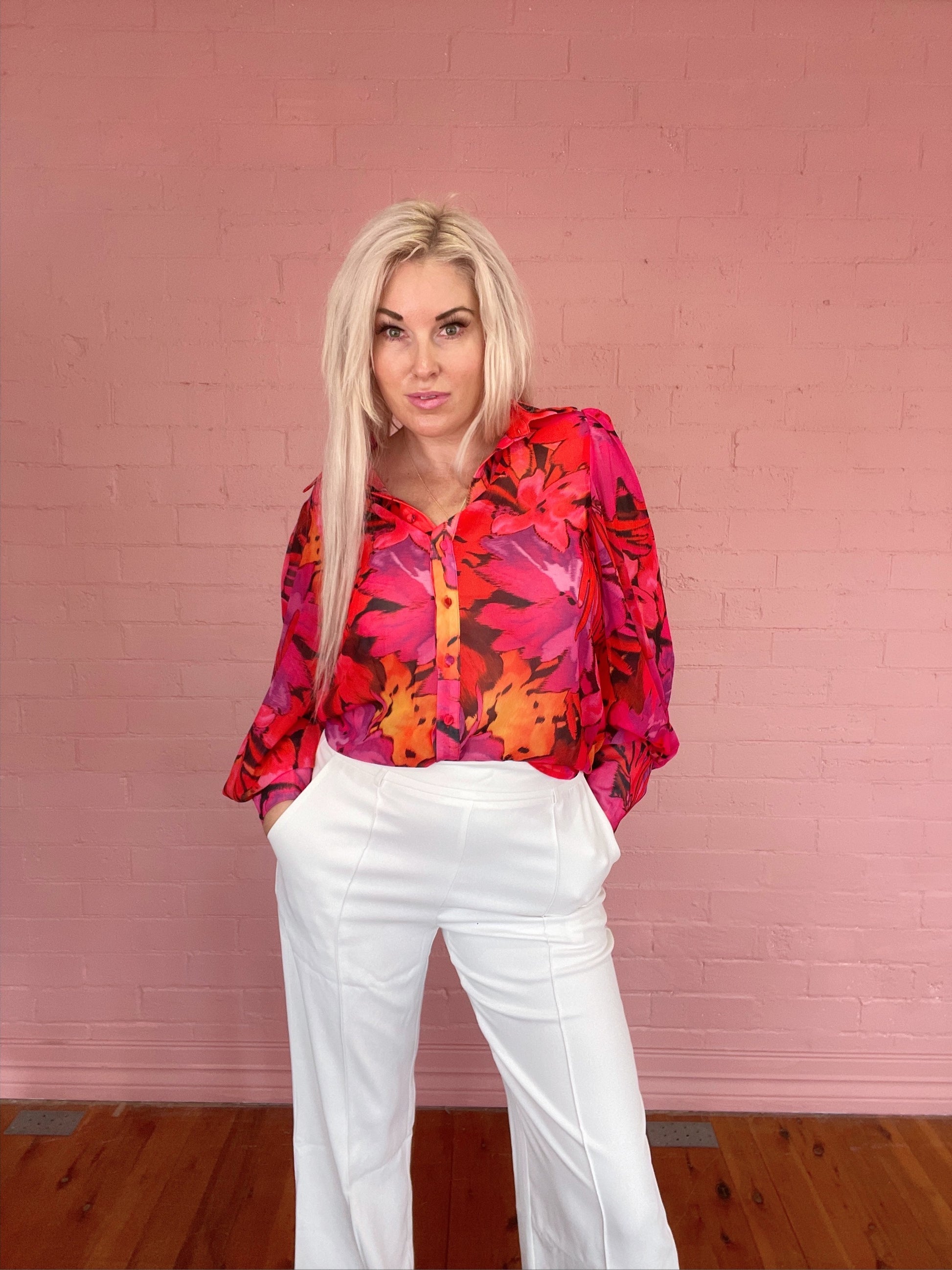 Our Fleetwood blouse features, a long puff sleeve with a button detailing centre, front buttons, and a colour. This garment is slightly sheer, with no lining, and no stretch throughout the garment, 100% polyester.