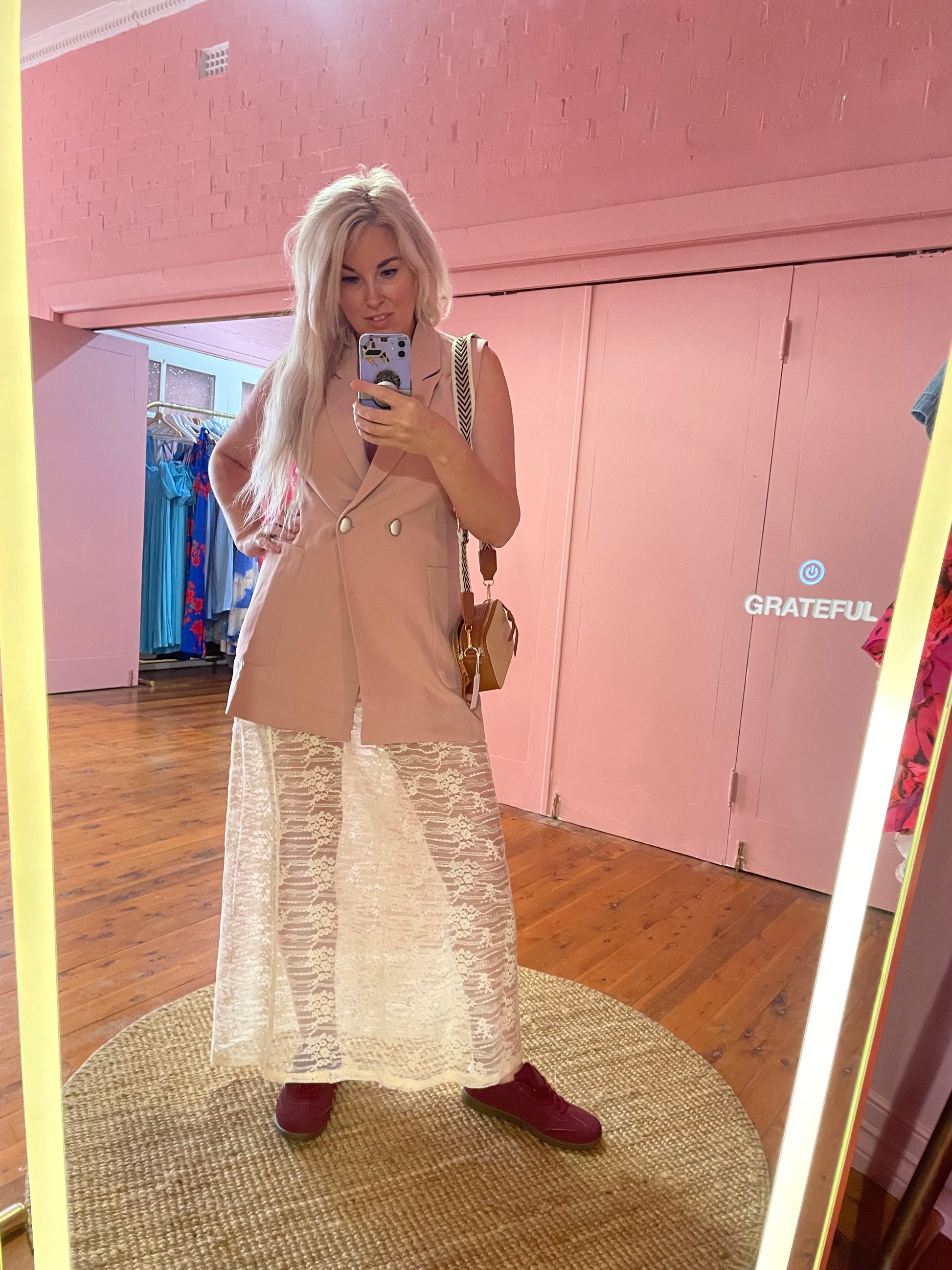 Upgrade your wardrobe in our RoseBlazer Vest, a sleeveless, oversized blazer-style vest designed for modern elegance. In a timeless, neutral beige tone, it’s the perfect layering piece. Style over a fitted top or wear solo for a bold statement.