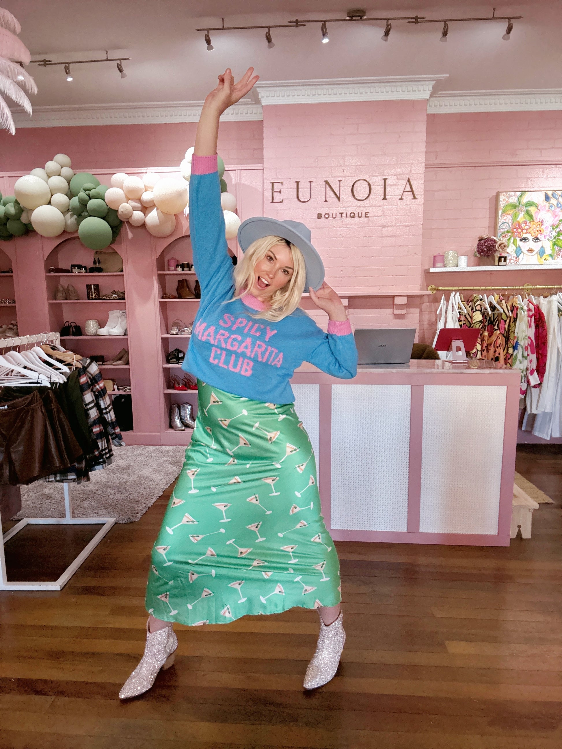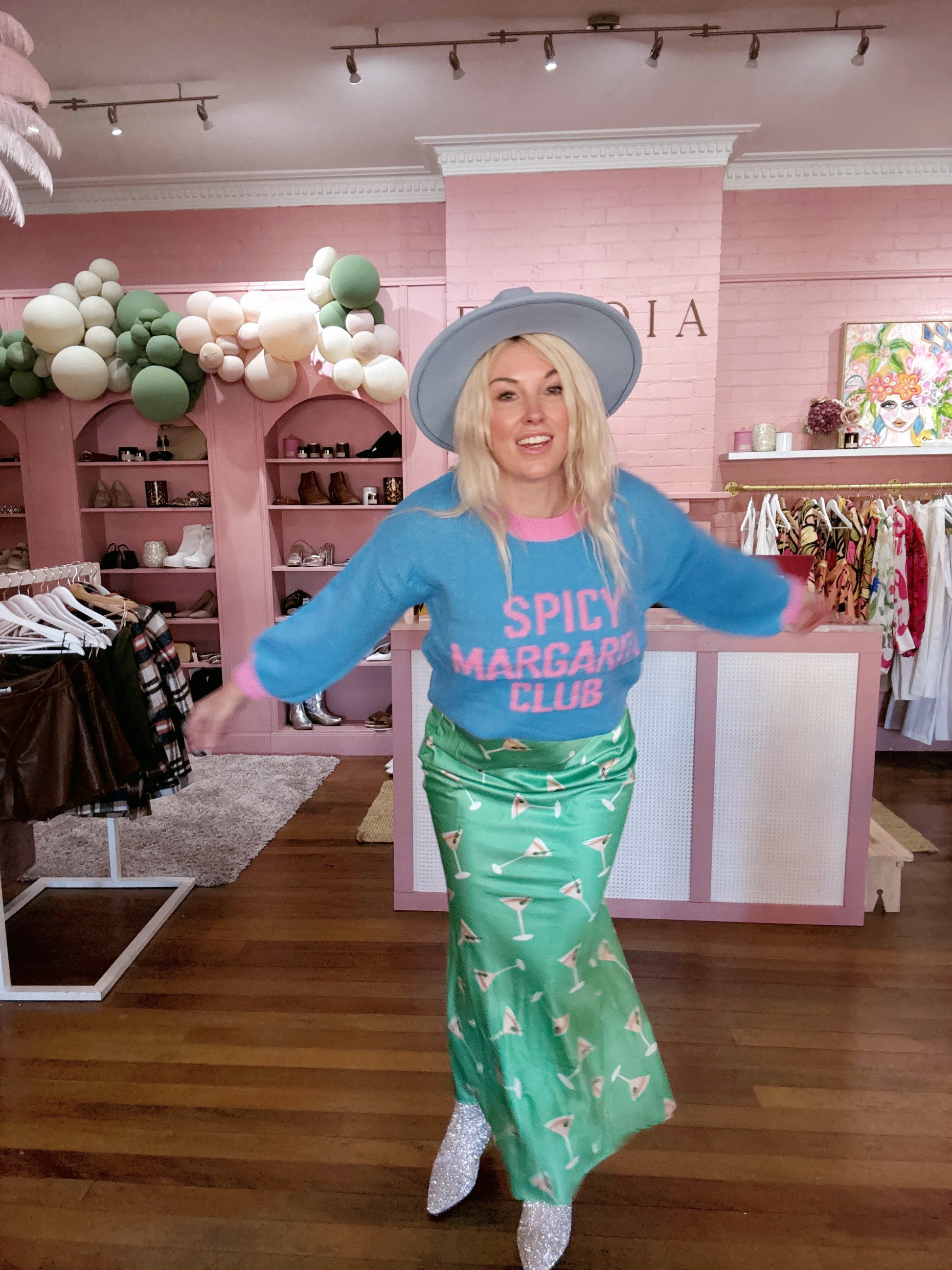 The Spicy Margarita Club Knit is your go-to for fun, feel-good fashion. With bold pink lettering on a bright blue base and bubblegum pink trim, this jumper is all about standing out and turning up the vibes. Soft, cosy, and totally extra – wear it with jeans, skirts or even sass it up with sequins.