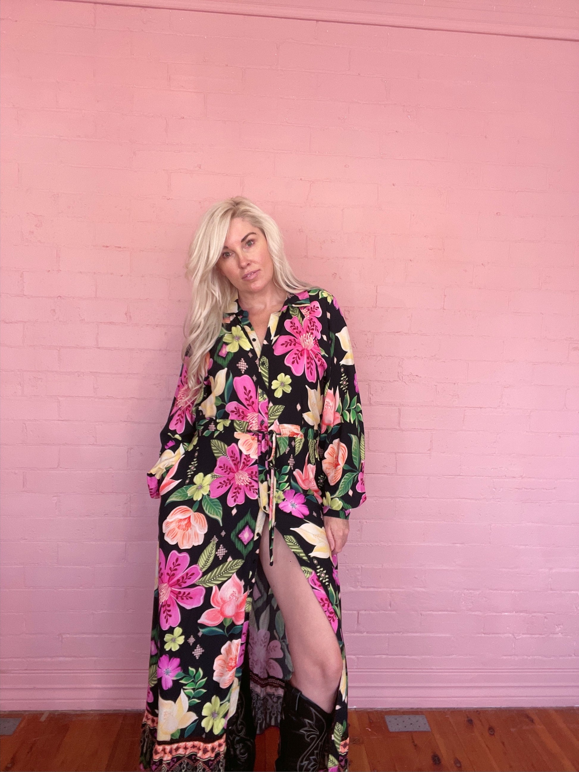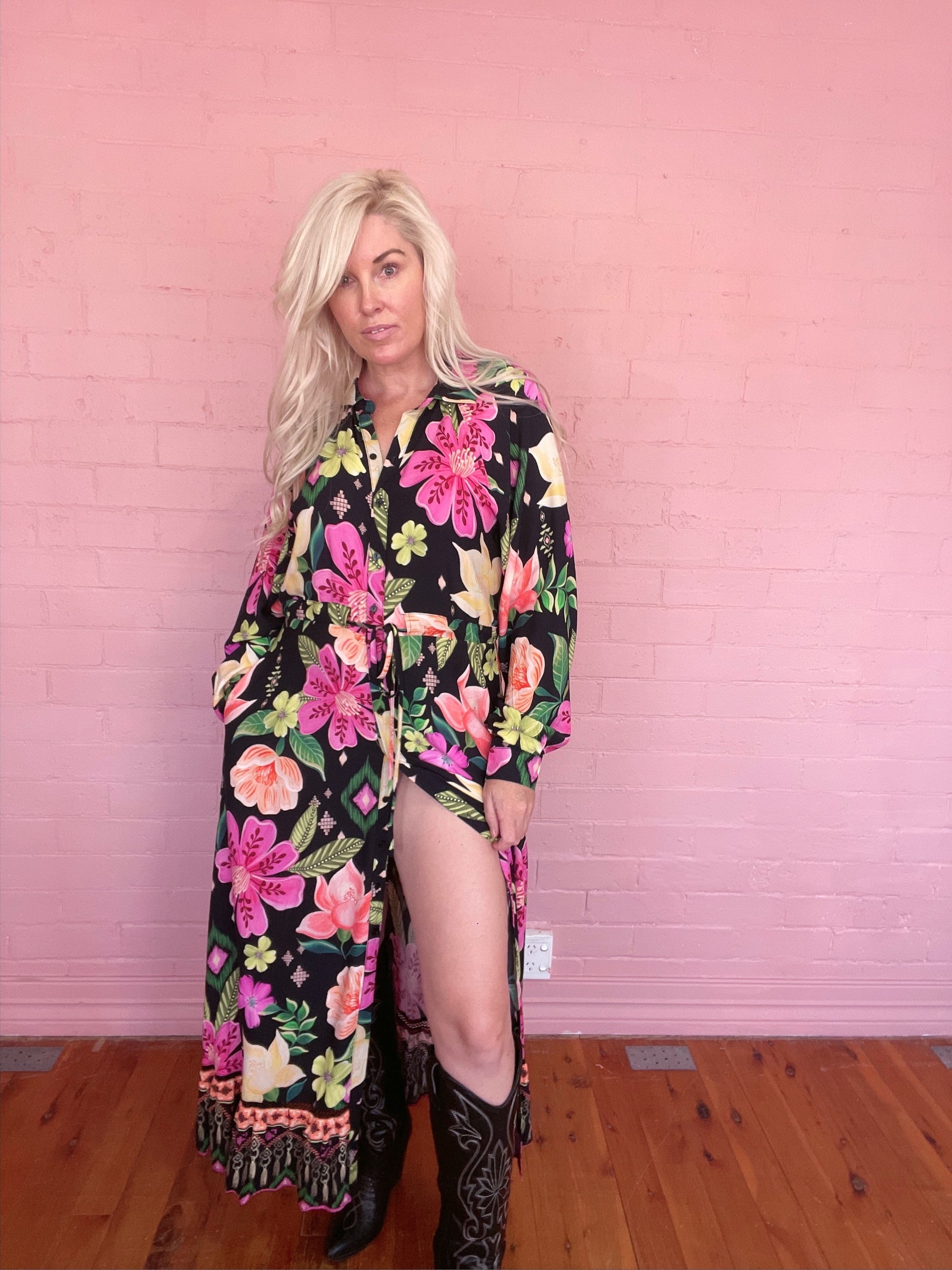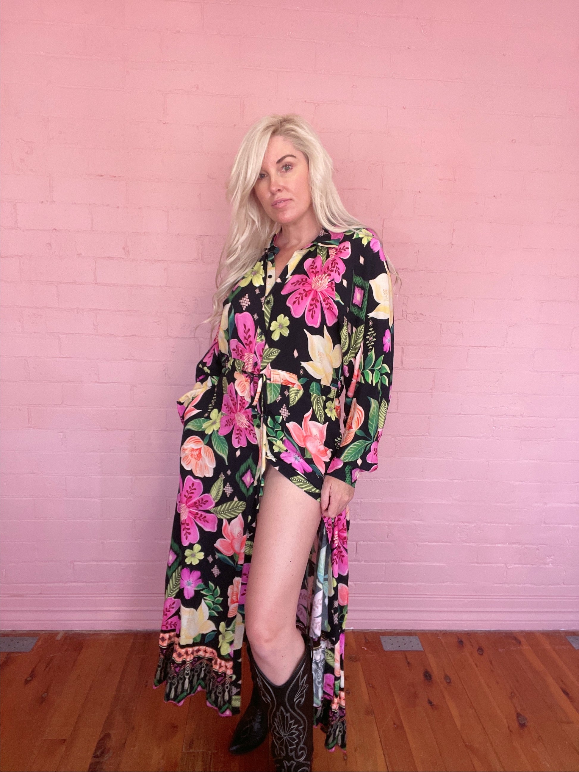 Bring bold, tropical energy to your wardrobe with our Tropical Nights Button-Up Maxi Dress. This vibrant statement piece features a lush floral print on a deep black backdrop, making it the ultimate show-stopper for day-to-night dressing. The relaxed silhouette is cinched at the waist with an adjustable drawstring for a flattering fit, while the button-down front and front slit add movement and allure. Style it with cowboy boots for a playful contrast or strappy sandals for vacation-ready vibes.