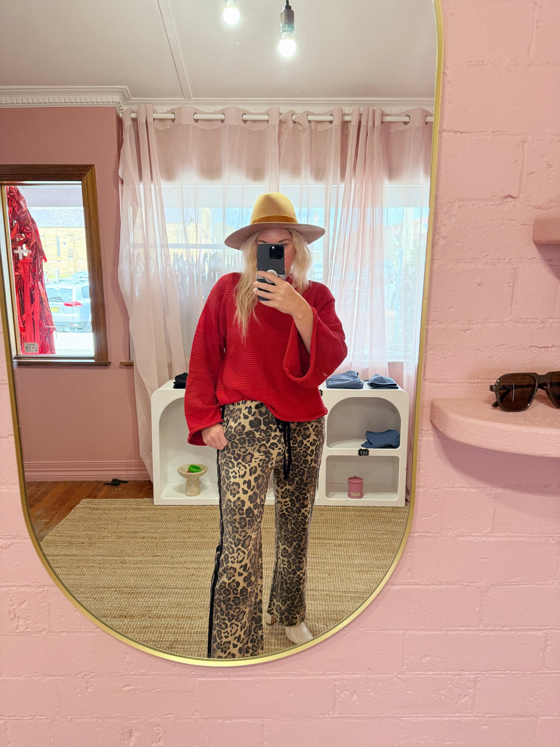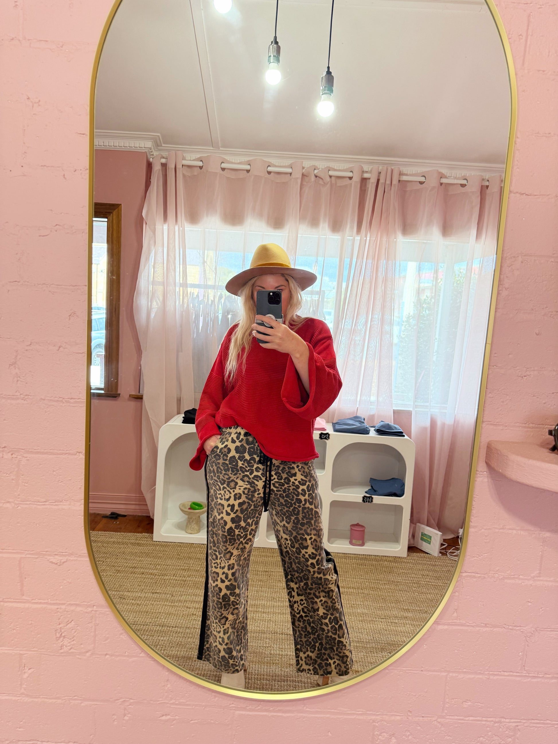 Add a bold pop of colour to your winter wardrobe with our Aspen Knit in Cherry Red. This cozy knit features a relaxed, slouchy fit with dropped shoulders and wide sleeves for effortless off-duty style. Crafted from a soft, ribbed fabric, it’s perfect for layering on chilly days without feeling bulky. Whether paired with jeans, skirts, or your favourite leopard lounge pants – this piece brings a vibrant edge to any look.