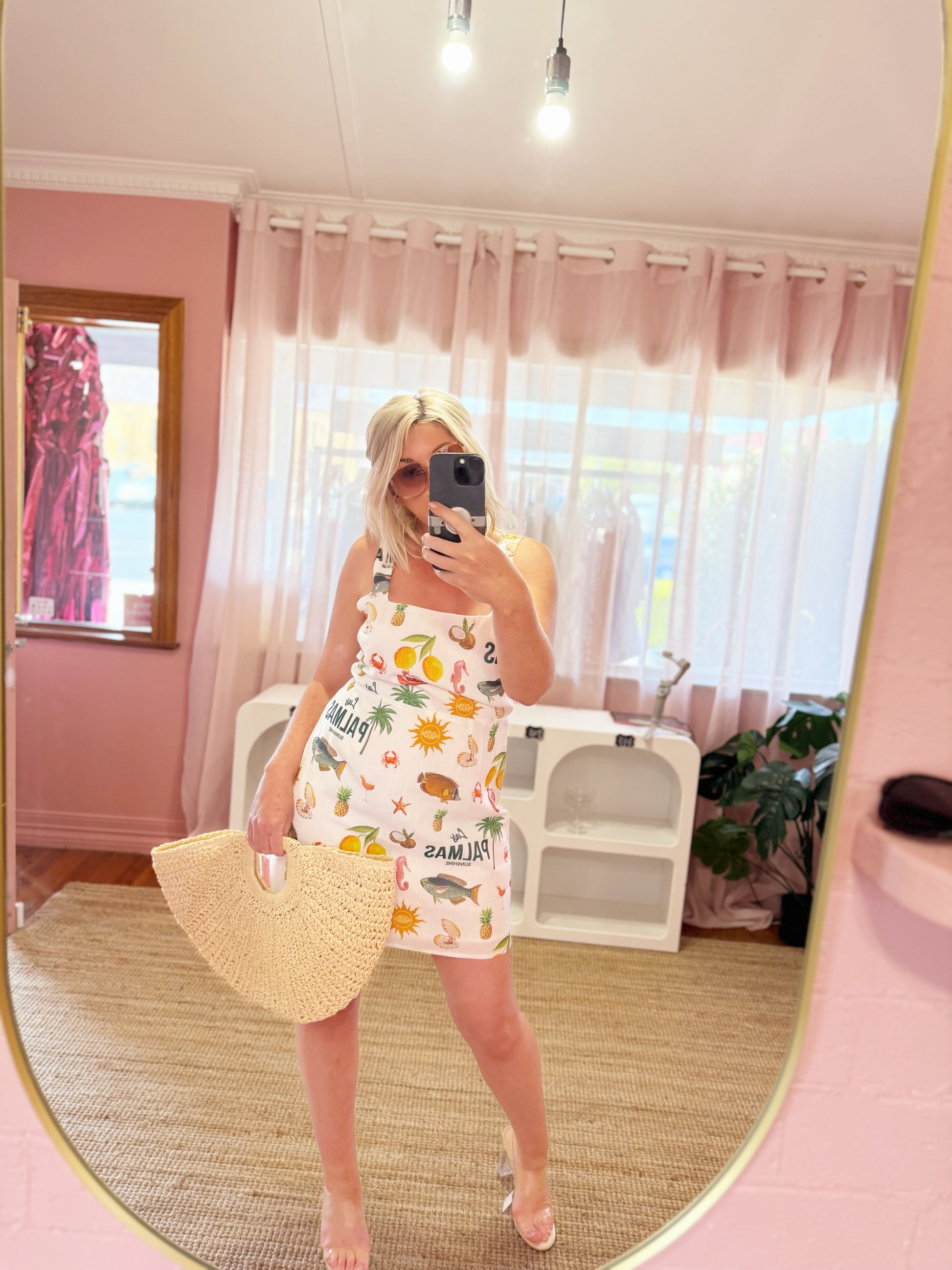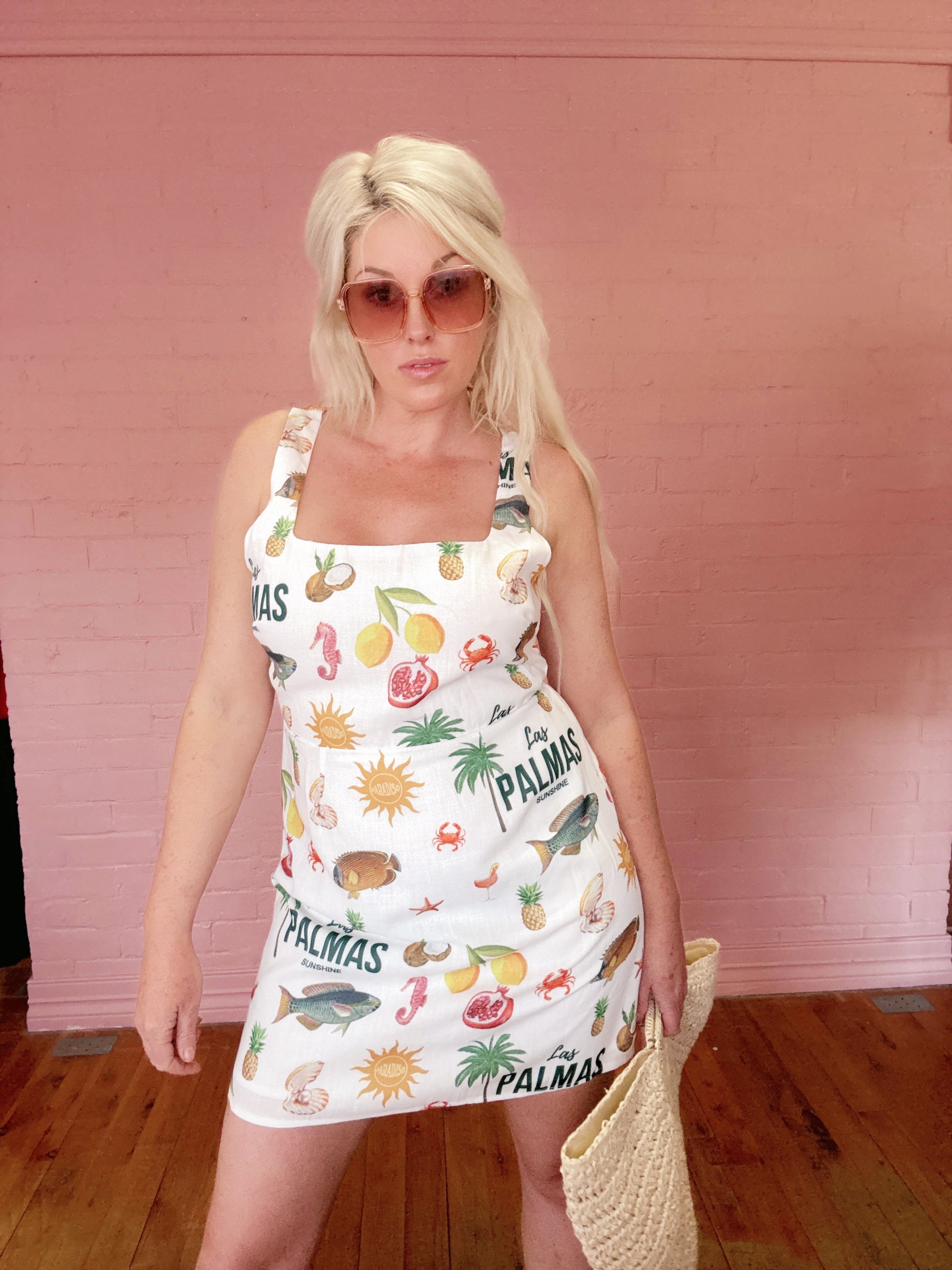This effortless dress features a charming vintage-inspired graphic print that mixes tropical fruit, colorful sea life, palm trees, and the iconic "Las Palmas" text.