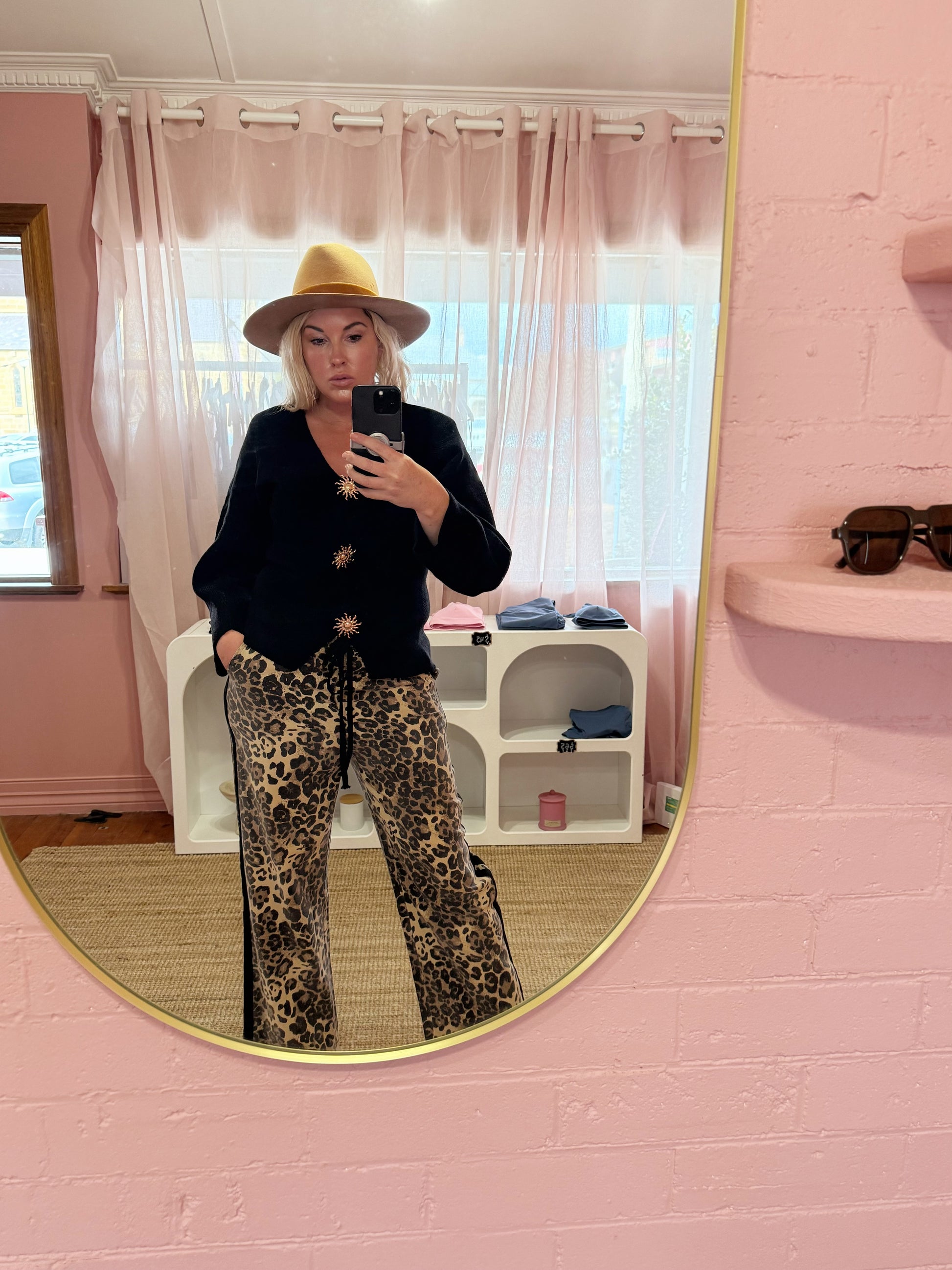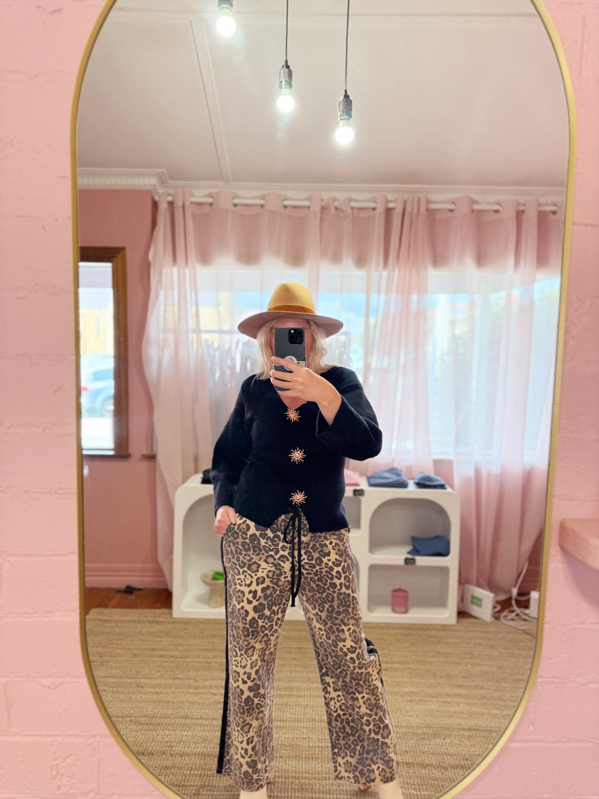 Turn heads in the Soleil Cardi – a statement piece that fuses cozy comfort with radiant detail. This deep black cardigan features luxe gold sunburst buttons that shimmer with a touch of glam, making it more than just your average knit. The flattering v-neckline and soft, relaxed fit make it ideal for layering or wearing solo as a top. Whether paired with denim or dressed up with bold prints, this cardi brings effortless drama to any outfit.